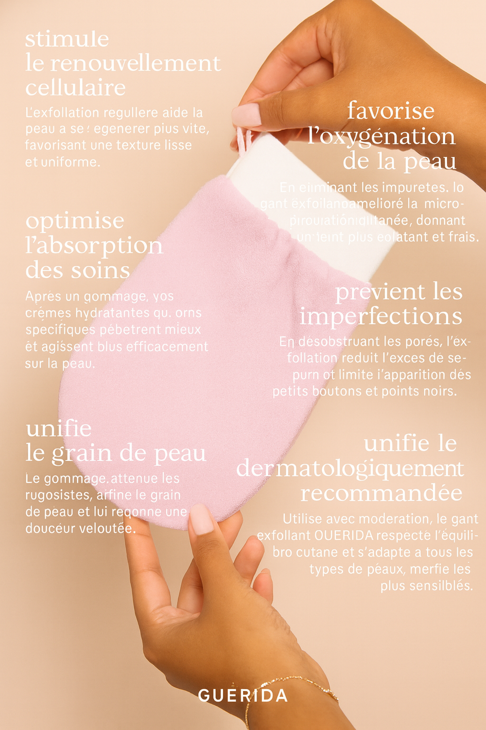 Utilisé avec modération, le gant exfoliant GUÉRIDA respecte l’équilibre cutané et s’adapte à tous les types de peaux, même les plus sensibles.